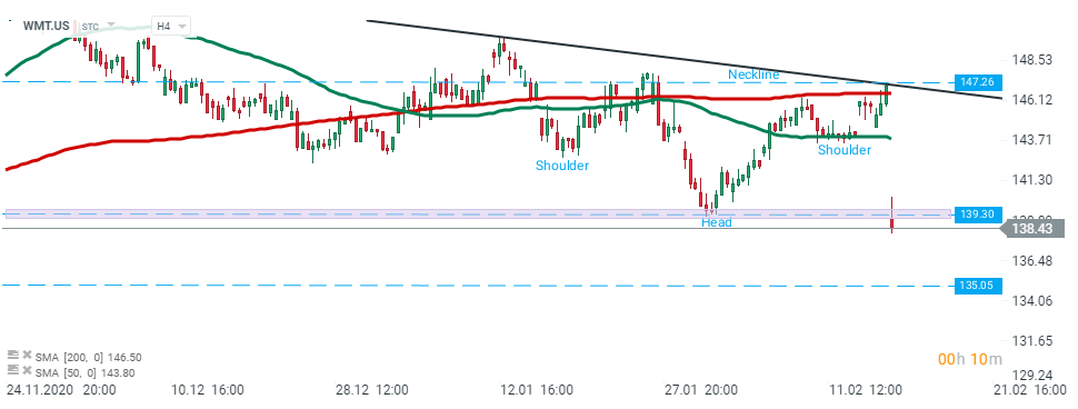 Walmart (WMT.US) – buyers yesterday failed to break above the downward trendline which coincides with a neckline of potential reverse head and shoulders formation at $147.26. Stock launched today’s session sharply lower following a disappointing earnings report. If the current sentiment prevails, downward move could be extended to the $135.05 level. Source: xStation5