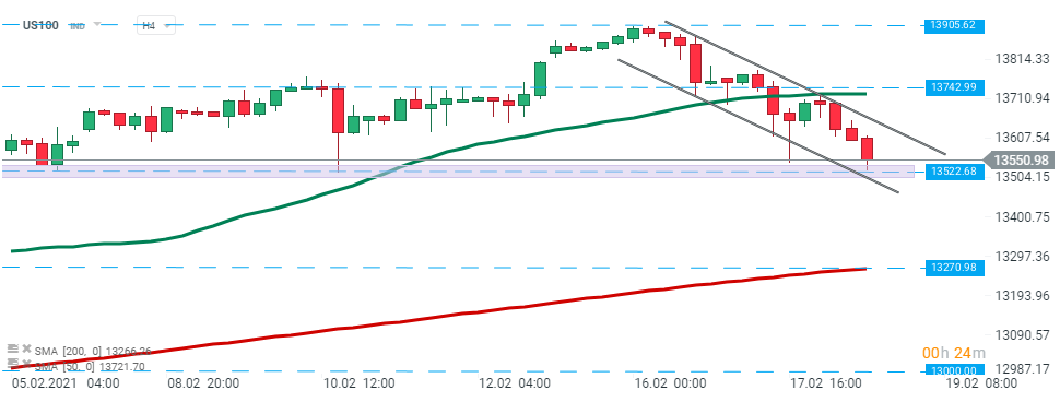 US100 is testing major support at 13.522 pts which is additionally strengthened by lower limit of the descending channel. In case a break below occurs, the downward move may accelerate towards 13,270 pts which coincides with 200 SMA (red line). On the other hand , if buyers will manage to regain control, then another upward impulse towards resistance at 13,742 pts could be launched. Source: xStation5