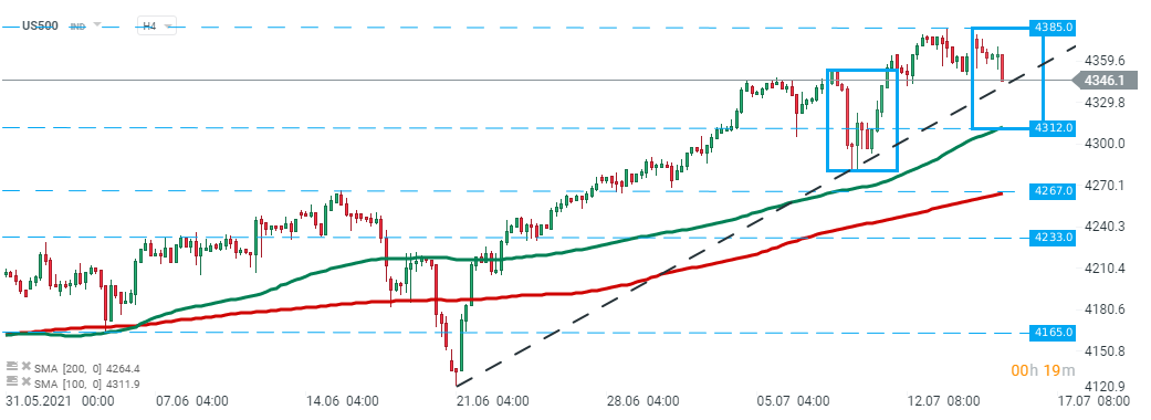 US500 pulled back from all-time high at 4385 pts and is currently testing an upward trendline. Should a break lower occur, then downward move may accelerate towards support at 4312 pts which is marked with lower limit of the 1:1 structure and 50 SMA (green line). Source: xStation5