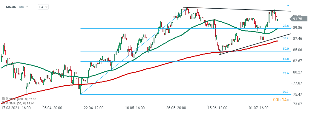 Morgan Stanley (MS.US) - yesterday buyers failed to break above the upper limit of the triangle formation and stock launched today’s session lower. If current sentiment prevails downward move may accelerate towards 50 SMA (green line) which coincides with 23.6 Fibonacci retracement of the recent upward wave. Source: xStation5