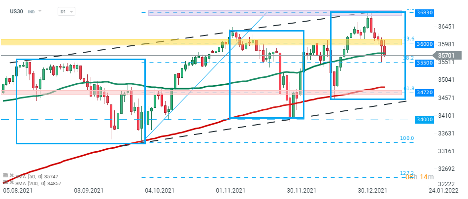 US30 fell sharply during yesterday's session, however buyers managed to halt declines around support at 35500 pts and index managed to erase majority of losses. Today's index failed to break above the local resistance at 36000 pts which coincides with 23.6% Fibonacci retracement of the last upward wave. Should break below the aforementioned support occur, downward move may accelerate towards next support at 34720 pts. Source: xStation5