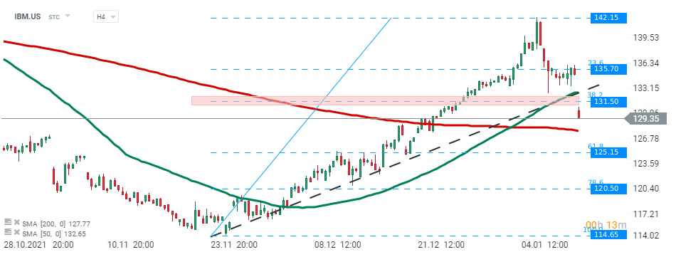 IBM (IBM.US) stock launched today's session lower and price broke below major support area around 131.50 which is marked with 38.2% Fibonacci retracement of the last upward wave , 50 SMA (green line and upward trendline. If current sentiment prevails downward move may accelerate towards next support at $125.15. Source: xStation5