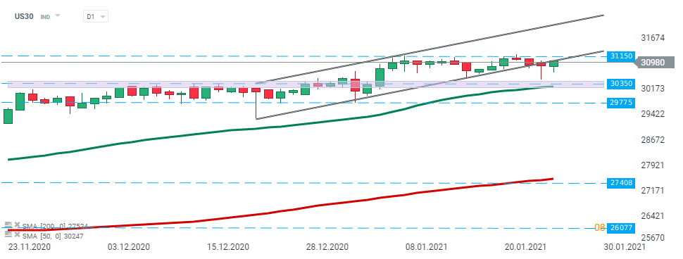 US30 - yesterday index broke below the lower limit of the ascending channel, however sellers failed to uphold momentum and price bounced off the support at 30,350 pts and is currently approaching earlier broken trendline which coincides with resistance at 31,150 pts where all-time highs are located. If break above occurs then upward move could be extended towards the upper limit of the channel. On the other hand, failure to break high could see the index pull back towards the aforementioned support at 30,350 pts. Source: xStation5