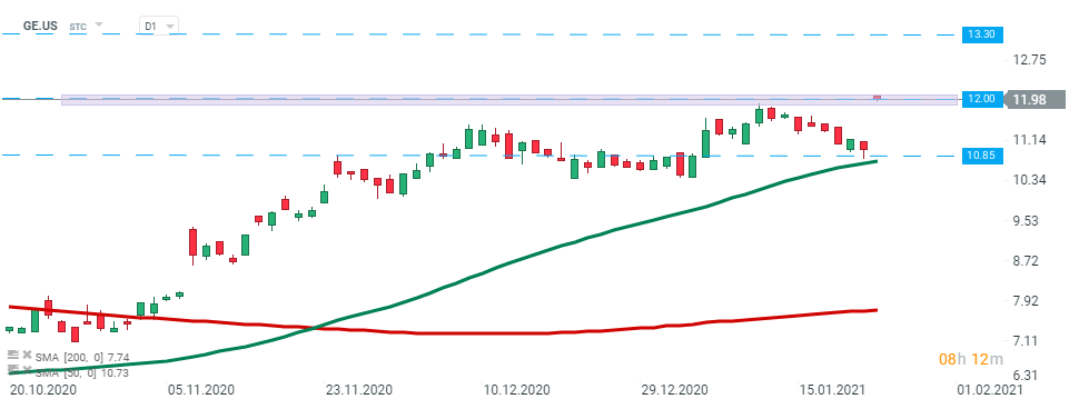 General Electric (GE.US) stock launched today’s session with a bullish price gap and is currently testing local resistance at $12.00 where this month’s highs are located. If the current sentiment prevails, upward move could be extended to the $13.30 level. However if sellers manage to regain control, the downward correction may start. The nearest support for buyers lies at the $10.85 level and is additionally strengthened by 50 SMA (green line). Source: xStation5