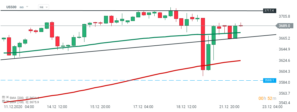US500 – yesterday’ downward move was halted by the 200 SMA (red line) and index managed to erase most of its recent losses. Today US500 bounced of the lower limit of the triangle pattern and break above the 50 SMA (green line). If the current sentiment prevails, the upward move could be extended to the 3717 pts handle. Source: xStation5