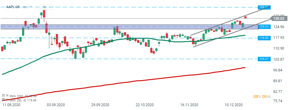 Apple (AAPL.US) stock launched today’s session higher and is testing upper limit of the upward channel. If buyers will manage to uphold momentum, then another upward impulse towards ATH at $138.00 could be launched. Source: xStation5