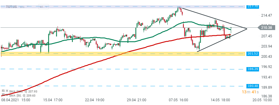 Target (TGT.US) stock launched today’s session slightly higher and is approaching the upper limit of the triangle formation. Should break higher occur, then upward move may accelerate towards all-time high at $217.70. However, given the risk-off sentiment which prevails on the markets today, another downward move cannot be ruled out. In this scenario the nearest support lies at $201.52. Source: xStation5