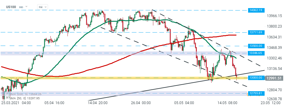 US100 fell sharply today and is testing major support at 13055 pts  which coincides with the long-term trendline and lower limit of the wedge formation. A break lower may lead to a bigger downward move. Next target for bears is located at 12755 pts support. On the other hand, if buyers will manage to halt declines here, then another upward impulse towards resistance at 13386 pts may be launched. Source: xStation5