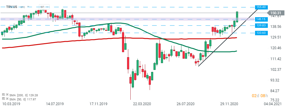 Travelers (TRV.US) stock launched today’s session higher and brokeabove the major resistance at $145.15. If the current sentiment prevails, upward move could be extended to the $155.40 level where all-time highs are located. However if sellers manage to regain control and break below the aforementioned $145.15 level, then downward impulse toward support at $ 139.83 could be launched. Source: xStation5