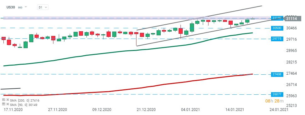 US30 finished yesterday's session higher however buyers struggle to break above the 31,150 pts level despite the positive market sentiment. In case a profit taking occurs and downward correction starts, one should focus on 30,500 pts level. On the other hand as long as the price sits above the lower limit of the ascending channel, continuation of an upward trend seems more probable. The next resistance to watch lies at the upper limit of the aforementioned ascending channel. Source: xStation5
