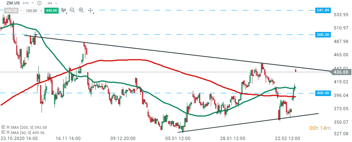 Zoom Video (ZM.US) stock launched today’s session sharply higher and price is approaching downward trendline. Should a break above the trendline occur, upward move may accelerate towards major resistance at $500.00. On the other hand, if sellers will manage to regain control, nearest support to watch lies at $400.00 and coincides with 50 SMA ( green line) and 200 SMA (red line). Source: xStation5