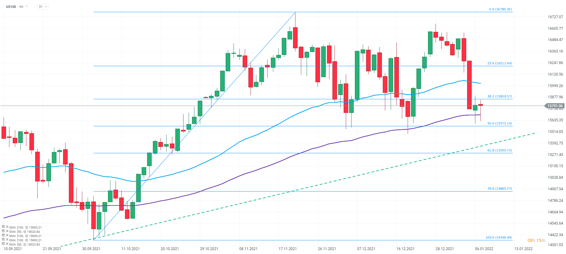 Looking at the chart of the US100 index on the D1 interval, we can see that currently the support level is being tested, which is determined by the confluence of the 50% Fibo and EMA 100 (purple line). If these supports are broken and declines accelerate, it is possible that levels near the lower limit of the long-term uptrend (green, dashed line) will be tested. The nearest resistance is the EMA 50 (blue line). Source: xStation 5