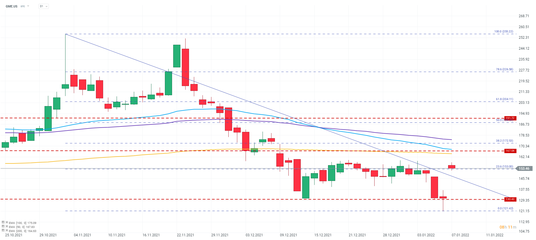 GameStop (GME.US) shares opened today's session with a strong bullish price gap, which exceeded the 23.6% Fibo limit. If the demand side manages to maintain the current gains, it is possible to continue the upward movement to the area of the EMA 200 (yellow line) and EMA 50 (blue line) confluence. The key support level remains the local low, near the level of $121.5 per share. Source: xStation 5