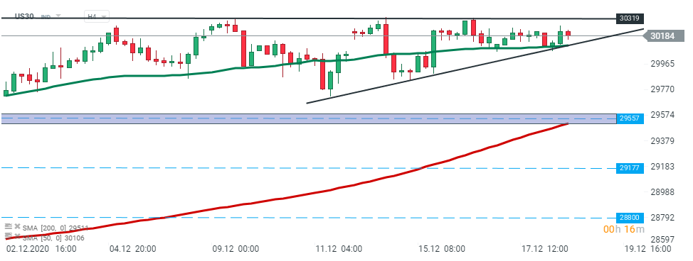 US indices launched today's session little changed, after hitting record highs in the previous session, as investors monitor progress on US stimulus negotiations. Senate Majority Leader Mitch McConnell said a bipartisan deal “appears to be close at hand” and House Speaker Nancy Pelosi also said Democrats were moving closer to a consensus. Lawmakers are running short of time to pass both pandemic rescue package but also a comprehensive spending bill to fund the government. Meanwhile Moderna's (MRNA.US) Covid-19 vaccine received a positive recommendation from the US FDA panel, setting it up for possible emergency use authorization by late today.