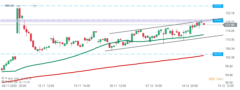 Darden Restaurants (DRI.US) - yesterday stock failed to break above the major resistance at $119.00 which coincides with upper limit of the upward channel. Stock launched today’s session lower on mixed quarterly results. If the current sentiment prevails then downward impulse towards 50 SMA (green line) could be launched. Source: xStation5