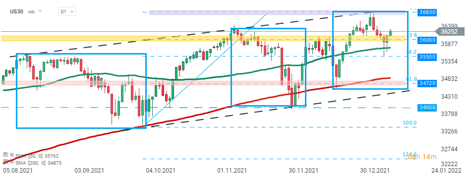 US30 managed to break above resistance at 36000 pts during yesterday's session following FED Chair comments. Index launched today's session higher and if current sentiment prevails upward move may accelerate towards all-time high at 36830 pts. However if sellers will manage to regain control then another downward impulse may be launched towards the aforementioned 36000 pts level. Source: xStation5