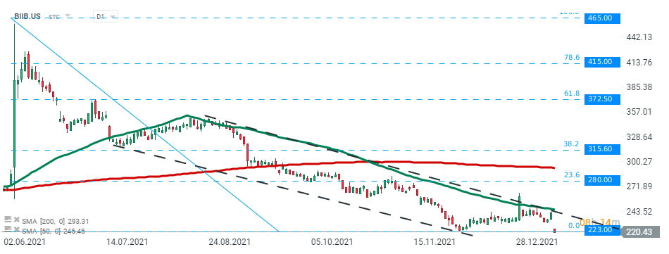 Biogen (BIIB.US) stock failed to break above the downward trendline and 50 SMA (green line) on Tuesday and downbeat moods prevail today. Stock launched today's session with a bearish price gap and is currently testing major support at $223.00. Source: xStation5