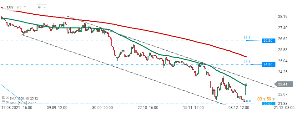 AT&T (T.US) stock launched today's session higher and is currently testing 50 SMA (green line). However only a break above the upper limit of the descending could herald a potential significant upward move. Until price sits below, another downward impulse towards major support at $22.00 may be launched. Source: xStation5