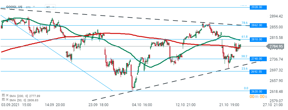 Alphabet (GOOGL.US) stock launched today’s session and tests 200 SMA (red line). Should a break lower occur, downward impulse towards next support at $2740 may be launched. This level coincides with 38.2% Fibonacci retracement of the last downward wave and lower limit of the triangle formation. On the other hand, if buyers manage to push price higher, then upward move may accelerate towards resistance at $2862 which is strengthened by 78.6% Fibonacci retracement, upper limit of the triangle formation. Source: xStation5