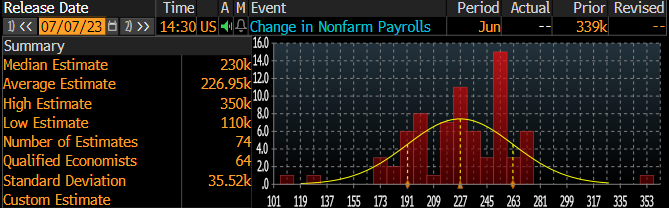 Range of estimates for today's NFP in a Bloomberg poll is wider than for yesterday's ADP but neither economist surveyed expects it to be as strong as ADP. Source: Bloomberg