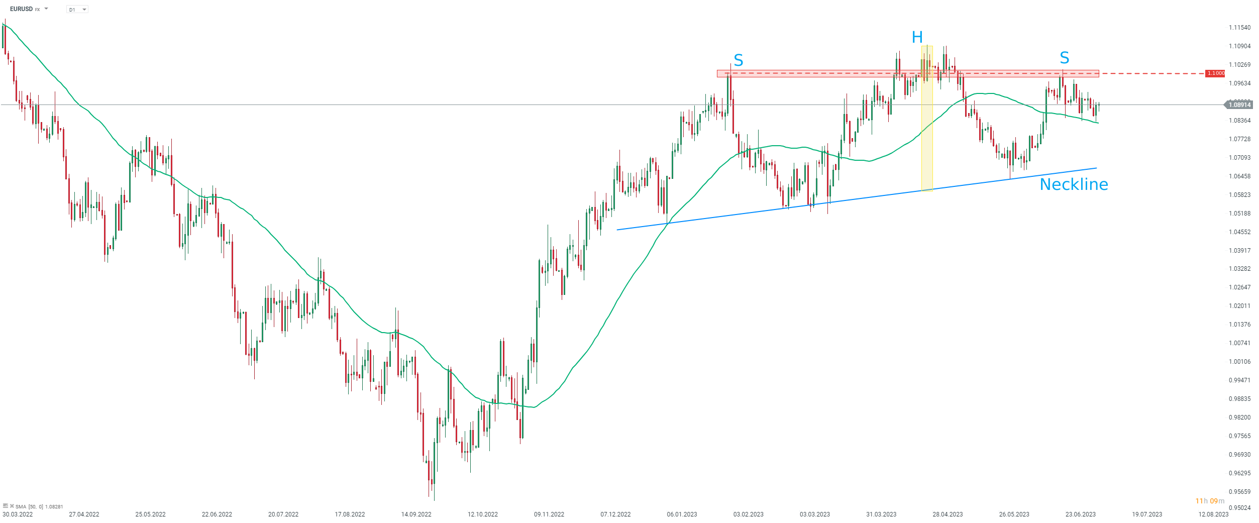 A wide head and shoulders pattern can be spotted on EURUSD market. The main currency pair has recently failed to break above the 1.10 mark and painted the right shoulder of the pattern in the process. Neckline of the pattern can be found slightly below the 1.07 mark and a break below could trigger a 500 pips move lower. Traders should note that the 50-session moving average proved to be a strong support recently and has been limiting recent downward moves. Source: xStation5