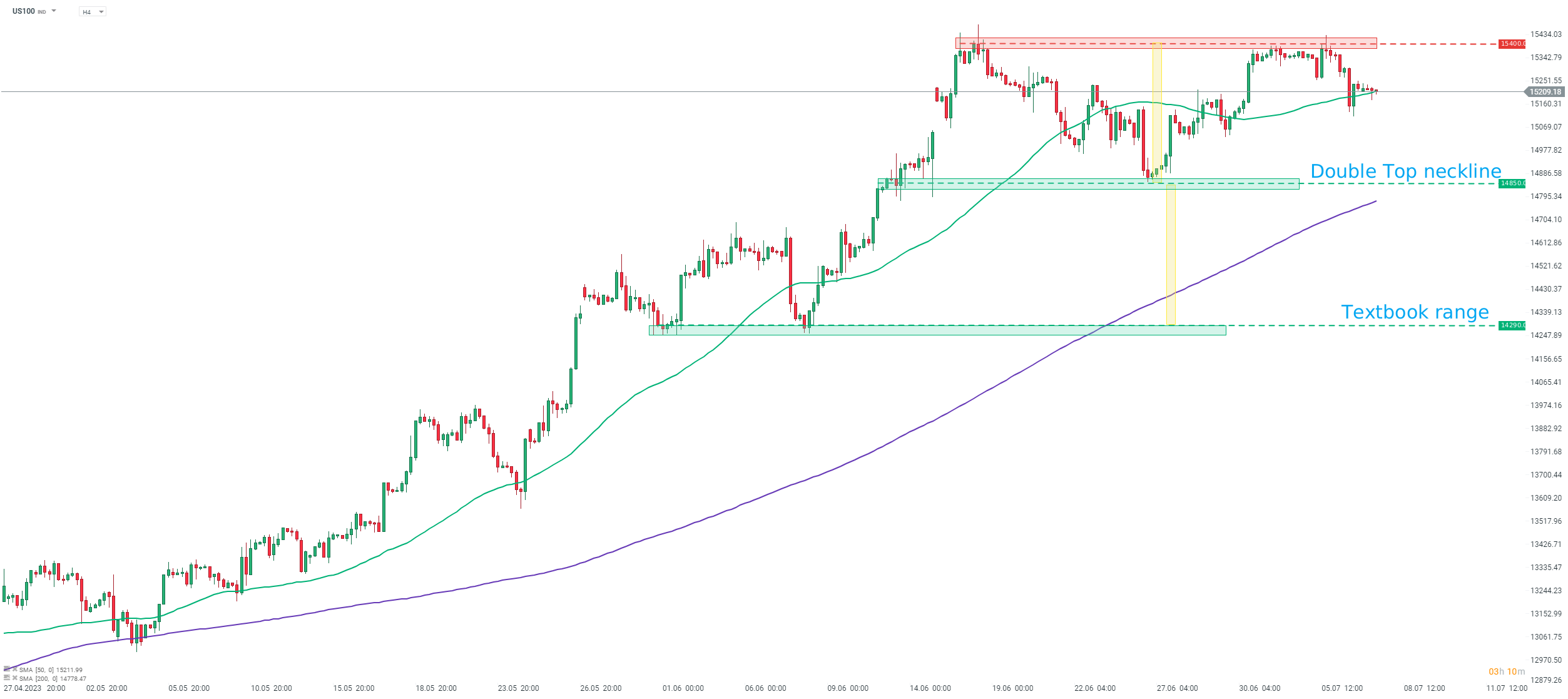 Nasdaq-100 (US100) started to struggle. Index has once again failed to break above 15,400 pts resistance zone, painting a double top in the process. Should the index continue to slide and breaks below the 14,850 pts zone, which is also marked with the neckline of the pattern, a deeper downward move may be looming. Textbook range of the downside breakout from the pattern suggests a possibility of a drop to as low as 14,290 pts. Source: xStation5
