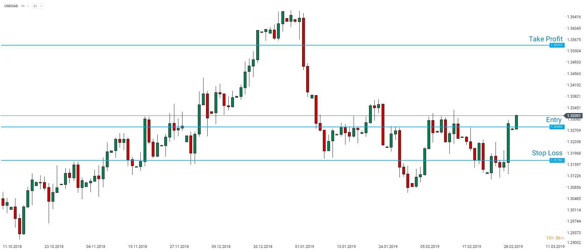 Goldman Sachs longpozíció felvételét javasolja az USDCAD devizapáron, 1.3284 szinten, 1.3551 célárral és 1.3175 stop loss szinttel. Forrás: xStation5