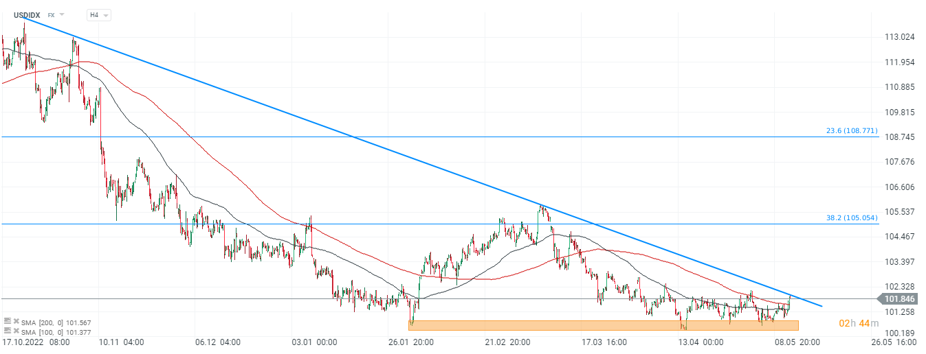 The dollar index (USDIDIX) is climbing above the SMA200 and the SMA100 on the H4 interval is struggling to break above the declining trend line set from the October 2021 levels. The price has formed a strong support line near the psychological limit of 100 points. Source: xStation5