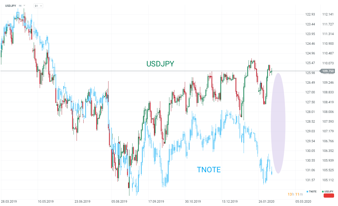 Az USDJPY fx pár általában szorosan korrelál a TNOTE-val (a korreláció negatív, ezért a TNOTE chartja fordított). Láttuk ezt 2019 folyamán, de idén jelentős divergencia van a két piac között. Úgy tűnik, hogy az erős TNOTE tükrözi a kockázatkerülést, ugyanakkor a magas USDJPY ráta tükrözi a részvénypiacok szelíd hangulatait. Feltételezhetjük, hogy az ilyen ellentmondásos piaci magatartás nem folytatódhat örökké, és ezek az eszközök újra összefonódhatnak. Ez elhozhat egy USDJPY visszaesést, a TNOTE csökkenést vagy a kettő kombinációját.