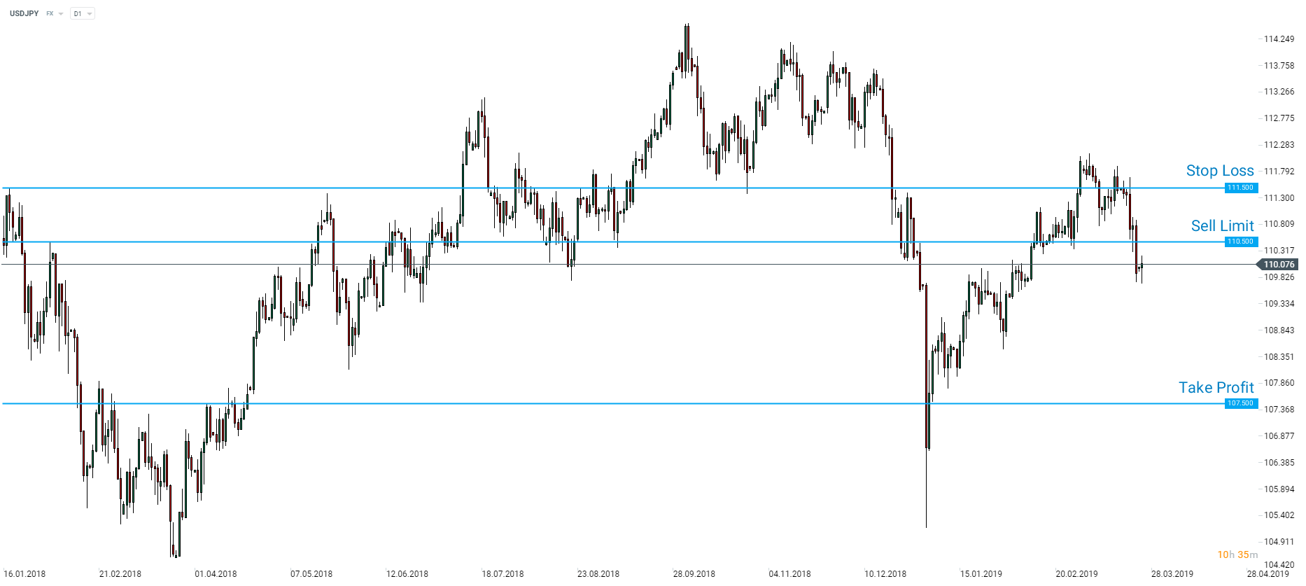Goldman Sachs short pozíció felvételét javasolja az USDJPY devizapáron, 110.50 limit megbízással, 107.50 célárral és 111.50 stop loss szinttel. Forrás: xStation5