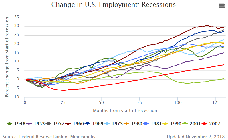 Éppen ellenkezőleg. Az elmúlt 100 évben az USA-ban 18 recesszió jelent meg. A válságban kettőt (az utolsót és a legsúlyosabb gazdasági válság 1929-ben kezdődött el) jelölhetünk meg, egyes meglátások szerint hármat (még az 1920-1921-es években is). Az alábbi táblázatban (FED) a foglalkoztatottság változását mutatja a recessziók kezdetétől minden gazdasági válság idején 1948 óta. Amint az a grafikonon látható, az egyik jelentősen elmaradt. Ez volt az utolsó. A foglalkoztatottságban bekövetkezett változások alsó szintje a recesszió kezdete után 27 hónappal, -6,27% volt. Abban az időben a foglalkoztatotság változása plusszban volt a recesszió idején.