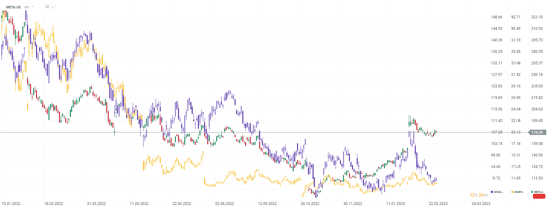 Shares of Meta Platforms (META.US), Alphabet (GOOGL.US) (purple) and Snap (SNAP.US) (yellow), D1 interval. Source: xStation5