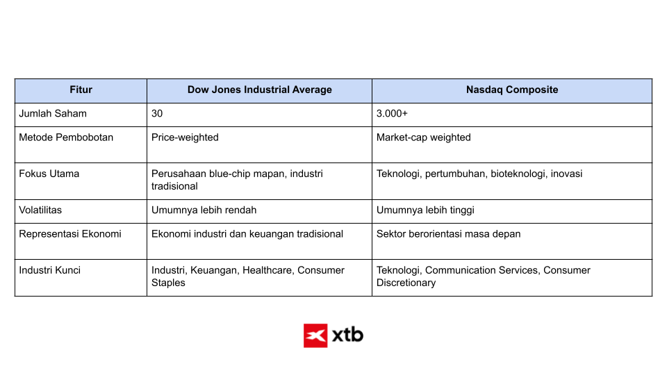Perbedaan utama terletak pada komposisi dan metodologi pembobotan. DJIA terdiri dari hanya 30 perusahaan blue-chip mapan dan menggunakan price-weighting, di mana saham dengan harga lebih tinggi memiliki pengaruh lebih besar. Nasdaq Composite mencakup lebih dari 3.000 saham terutama dari sektor teknologi dan pertumbuhan, menggunakan market-cap weighting yang memberikan pengaruh lebih besar kepada perusahaan dengan nilai pasar total lebih tinggi.
