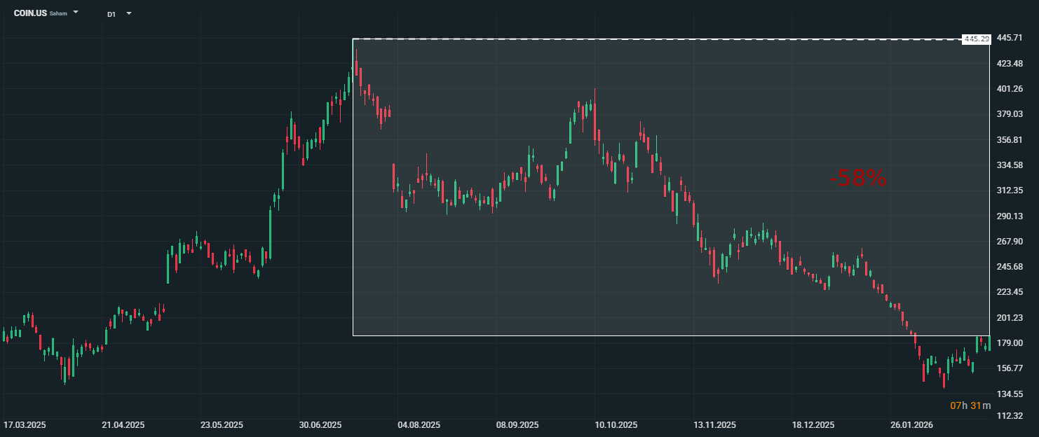 Di bawah tekanan penurunan Bitcoin, saham-saham yang terkait dengan cryptocurrency juga menunjukkan prospek negatif. Saham Coinbase - bursa cryptocurrency terbesar di Amerika Serikat - telah turun lebih dari 58% setelah mencapai puncak di $445. Jika kondisi pasar kripto tidak membaik, harga saham perusahaan ini berpotensi terus bergerak ke level yang lebih rendah.
