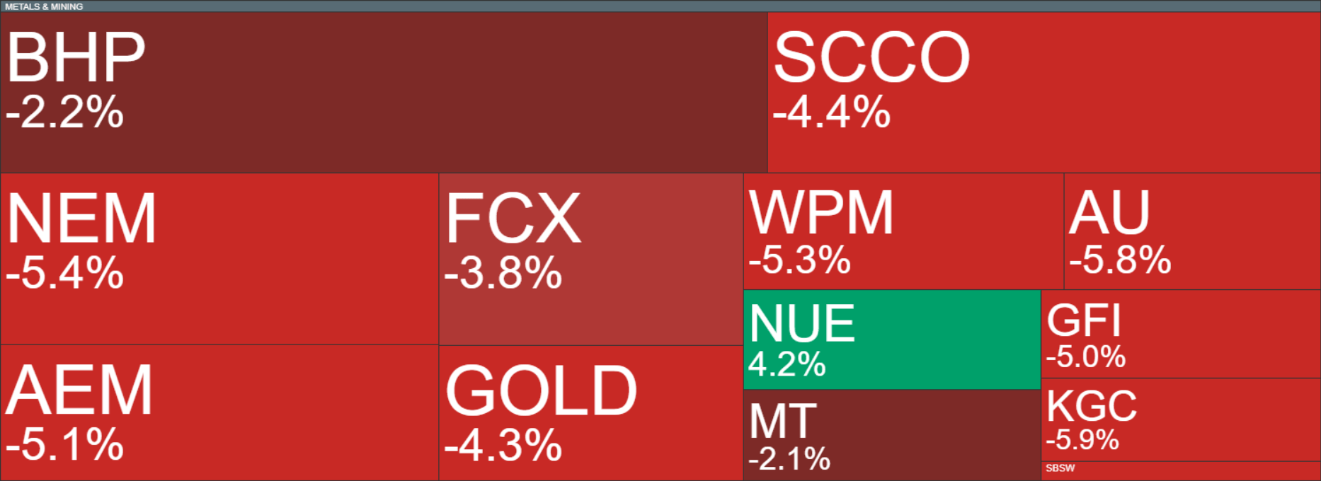 Melemahnya harga emas telah memberikan tekanan pada sektor logam dan pertambangan. Sebagian besar saham menunjukkan zona merah, dengan Nucor Corp (NUE) menjadi satu-satunya titik terang.