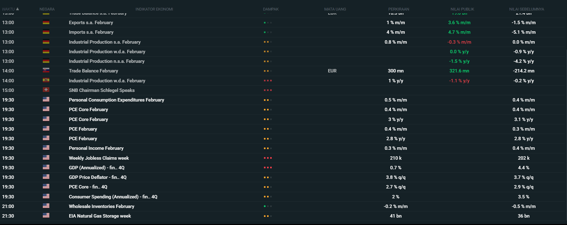 Karena situasi yang sangat dinamis di Timur Tengah, data makroekonomi AS hari ini kemungkinan memiliki dampak yang lebih kecil terhadap pasar dibandingkan biasanya. Laporan inflasi PCE bulan Februari dan belanja konsumen dianggap sudah usang, karena tidak mencerminkan harga minyak saat ini yang berada di atas $90 per barel. Meskipun demikian, jika data inflasi inti PCE secara tak terduga lebih tinggi - tetap di atas 3,1% - hal ini dapat secara signifikan memperkuat dolar AS.