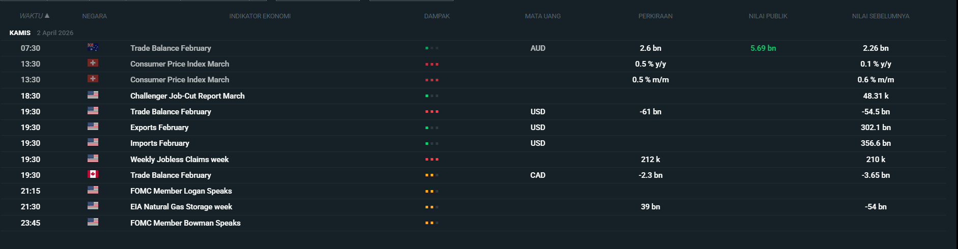Namun, beberapa data yang dijadwalkan rilis pada Kamis dapat berdampak signifikan pada volatilitas, terutama untuk US Dollar. Selain neraca perdagangan, laporan pasar tenaga kerja kecil akan dirilis di AS, melengkapi gambaran tantangan yang dihadapi Federal Reserve menjelang Non-Farm Payrolls (NFP) besok dan keputusan suku bunga yang dijadwalkan akhir bulan ini.