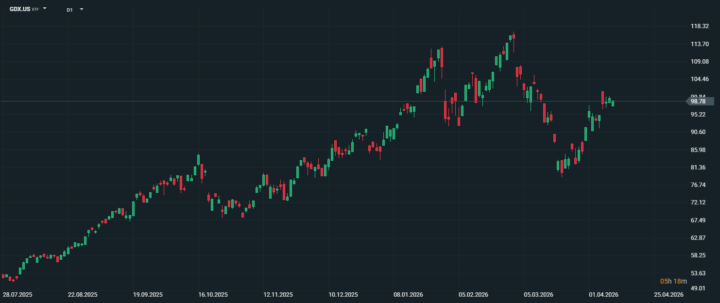 GDX tetap mencatatkan pertumbuhan pada sesi hari ini meskipun harga emas melemah. Sumber: xStation5
