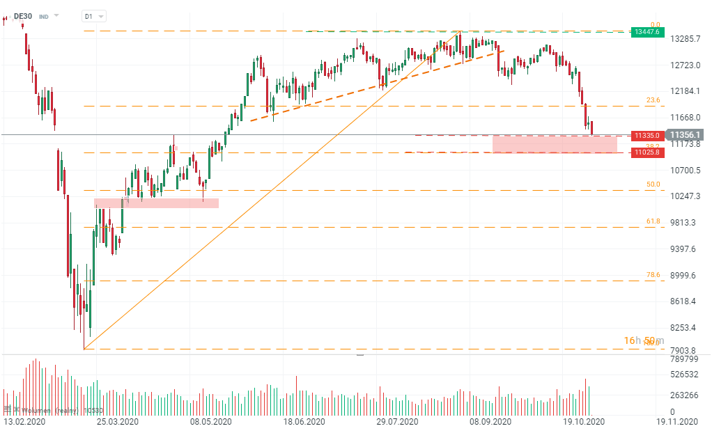 Os relatórios trimestrais das grandes empresas do setor da tecnologia foram bastante sólidos, mas pouco ajudaram a sustentar o sentimento do mercado. Os índices voltaram a registar novamente fortemente na abertura do mercado europeu, já que o último relatório na Alemanha mostrou que surgiram quase 19 mil novos casos. O DE30 acabou por desvalorizar perto dos 2% e volta a testar a região entre 11000 e 11335.