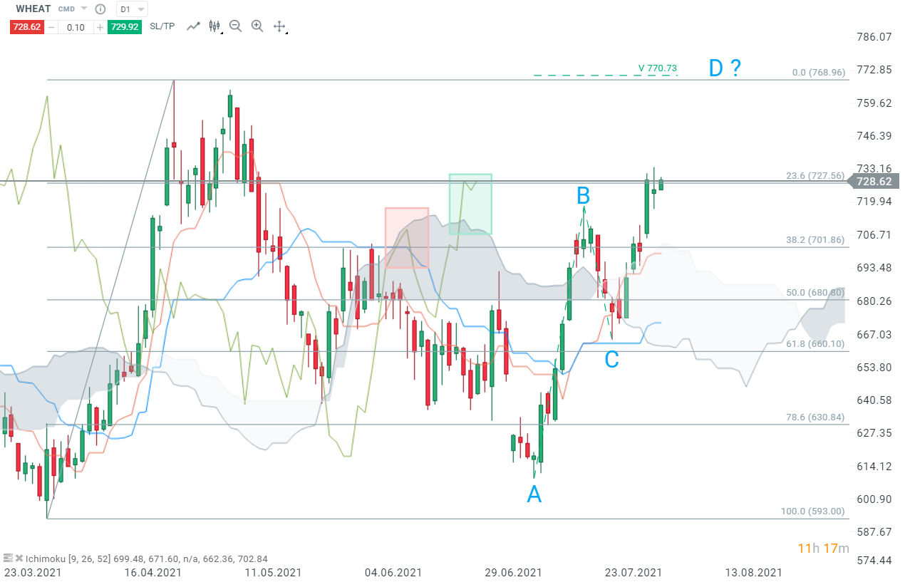 Depois dos compradores terem conseguido quebrar acima da nuvem Ichimoku diária, o preço acabou por atingir um novo máximo relativo junto da marca dos 718 (B), contudo, a força compradora acabou por não conseguir assumir o controlo do preço e acabou por surgir uma correção em baixa.