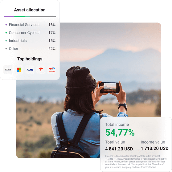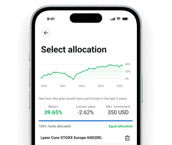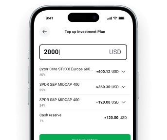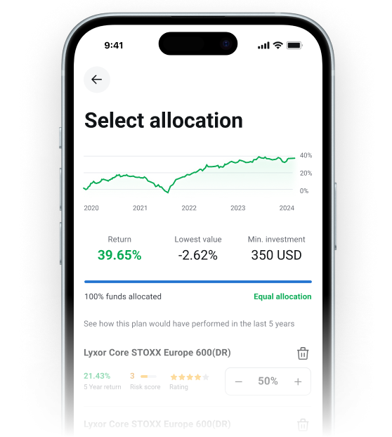 Top up your account regularly and invest automatically with Auto Invest. Simply select a specific amount, period, and deposit method and your funds will be systematically invested in ETFs of your choice, accordingly to the structure of your Plan.