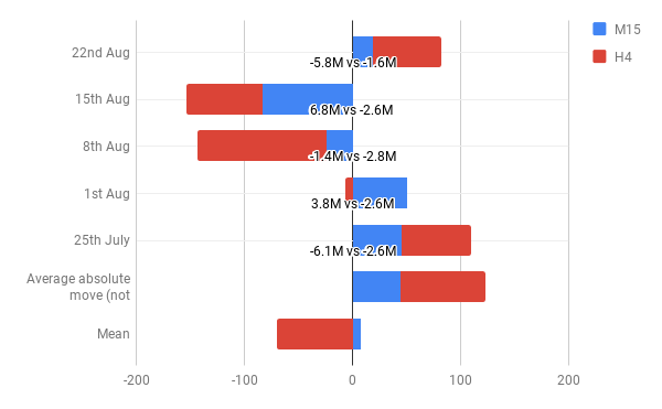 15 minutes after the last 5 releases the average size of the move has been 44.4 ticks with a mean move of +8. As you’d expect looking at the 4 hour timeframe the average moves have been larger, an an absolute move of 79.2 ticks with a mean of -70. Please note the average absolute move doesn’t take into account whether it was positive or negative whereas the mean does.