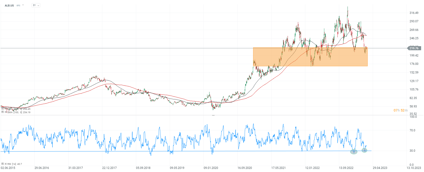 Albemarle (ALB.US) shares, D1 interval. Although the SMA200 and SMA100 averages are approaching a bearish 'death cross' formation, it is still not confirmed. If the decline deepens the $170 level may be worth watching. The RSI indicator has broken out a double bottom near 30 points, which historically has been an important support for the bulls and the level from which the price rebound occurred. Source: xStation5
