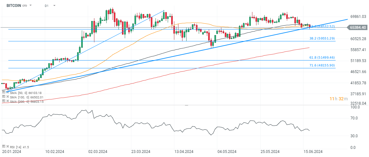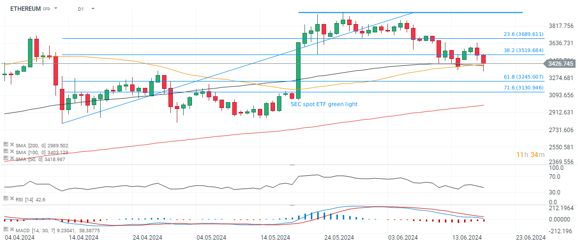 After Bitcoin touched the monthly lows near $65,000 some altcoin investors panicked selling smaller cryptocurrencies. Also, the second biggest cryptocurrency, Ethereum, dropped below the psychological support zone near $3,500 and is losing more than 2.5% today. In effect, we can see double-digit declines today with Eos, Chilliz, Fantom and Filecoin dropping the most from top100 projects. We can see strengthening US dollar today below key data from US retails sales (12:30 PM GMT) and manufacturing (13:15 PM GMT) so we can expect higher crypto volatility before the US market open. US 10-year treasury yields are close to 4.3% again. Since the previous week, we are also seeing US spot Bitcoin ETFs net outflows, which are now the biggest since March 2024 and failed to fuel the rally to new all-time highs.