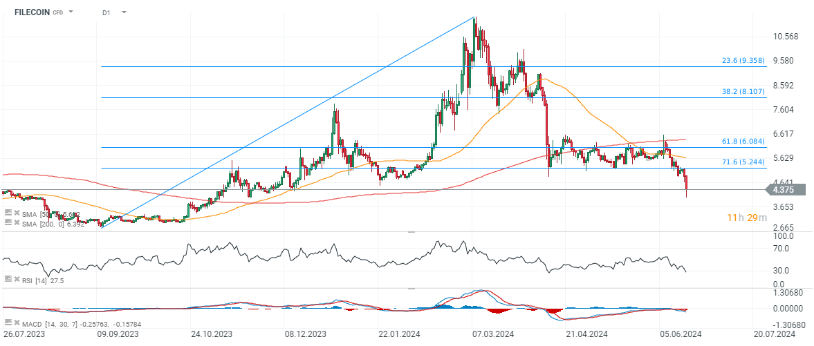 Filecoin drops to the lowest level since December 2023. The biggest, long term resistance zone is now located close to $6.4 level, where we can see SMA200 (red line). The RSI shows oversold conditions with reading below 30 points.