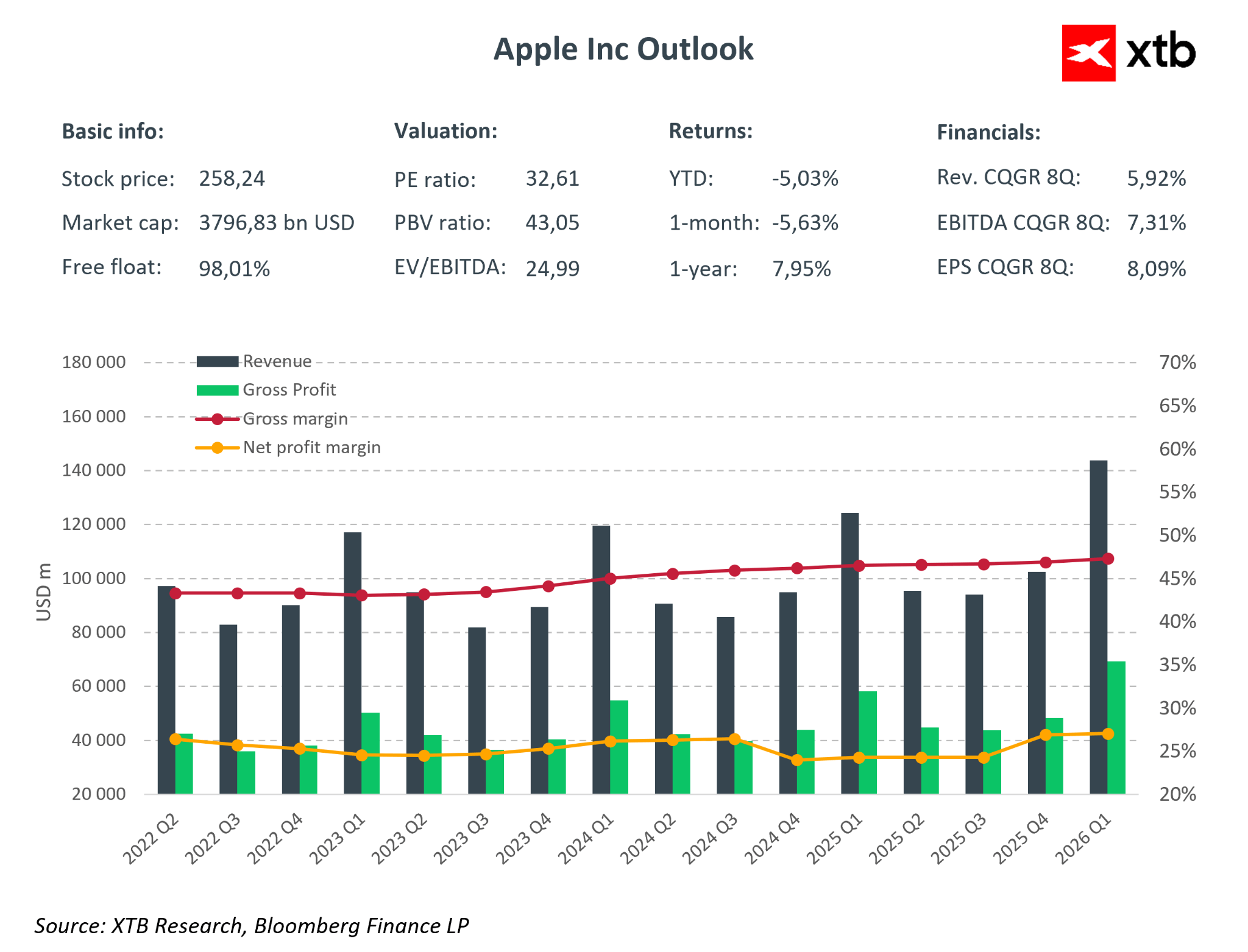 Apple shares have seen mixed performance over a one-year horizon and have retreated since the start of 2026. A powerful fiscal first quarter (calendar Q4 2025) should restore confidence in Apple’s position as one of Wall Street's most resilient blue chips. Source: Bloomberg Finance LP, XTB