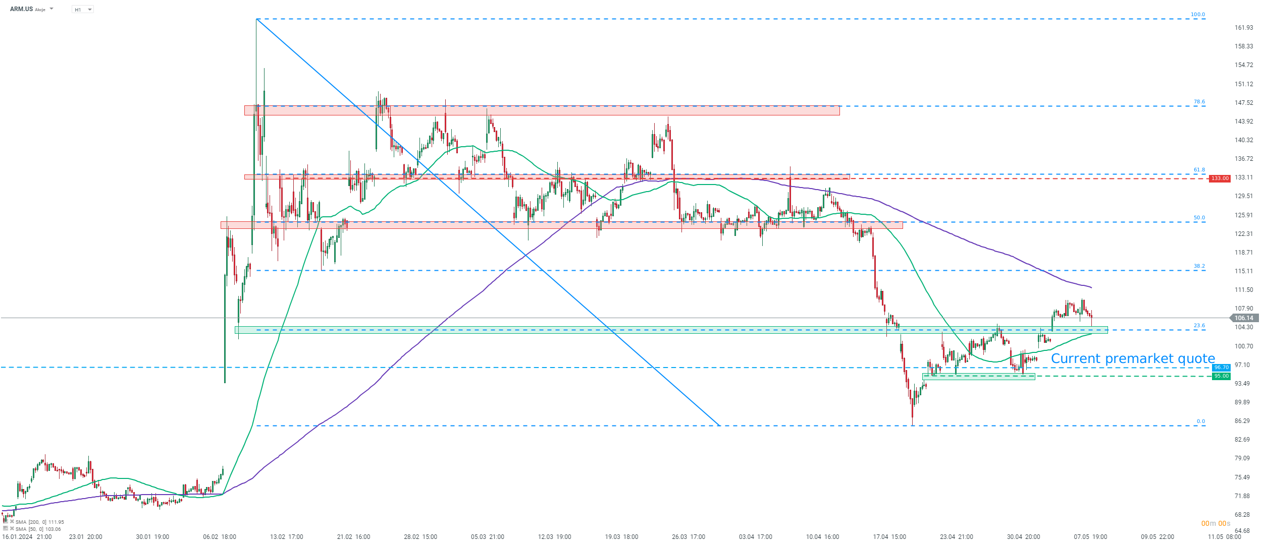 ARM Holdings (ARM.US) trades 8-9% lower in premarket, following release of fiscal-Q4 2024 earnings report that included disappointed forecasts. Stock is currently trading at around $96.70 in premarket, the lowest level since May 2, 2024. A near-term support zone can be found in the $95 area. Source: xStation5