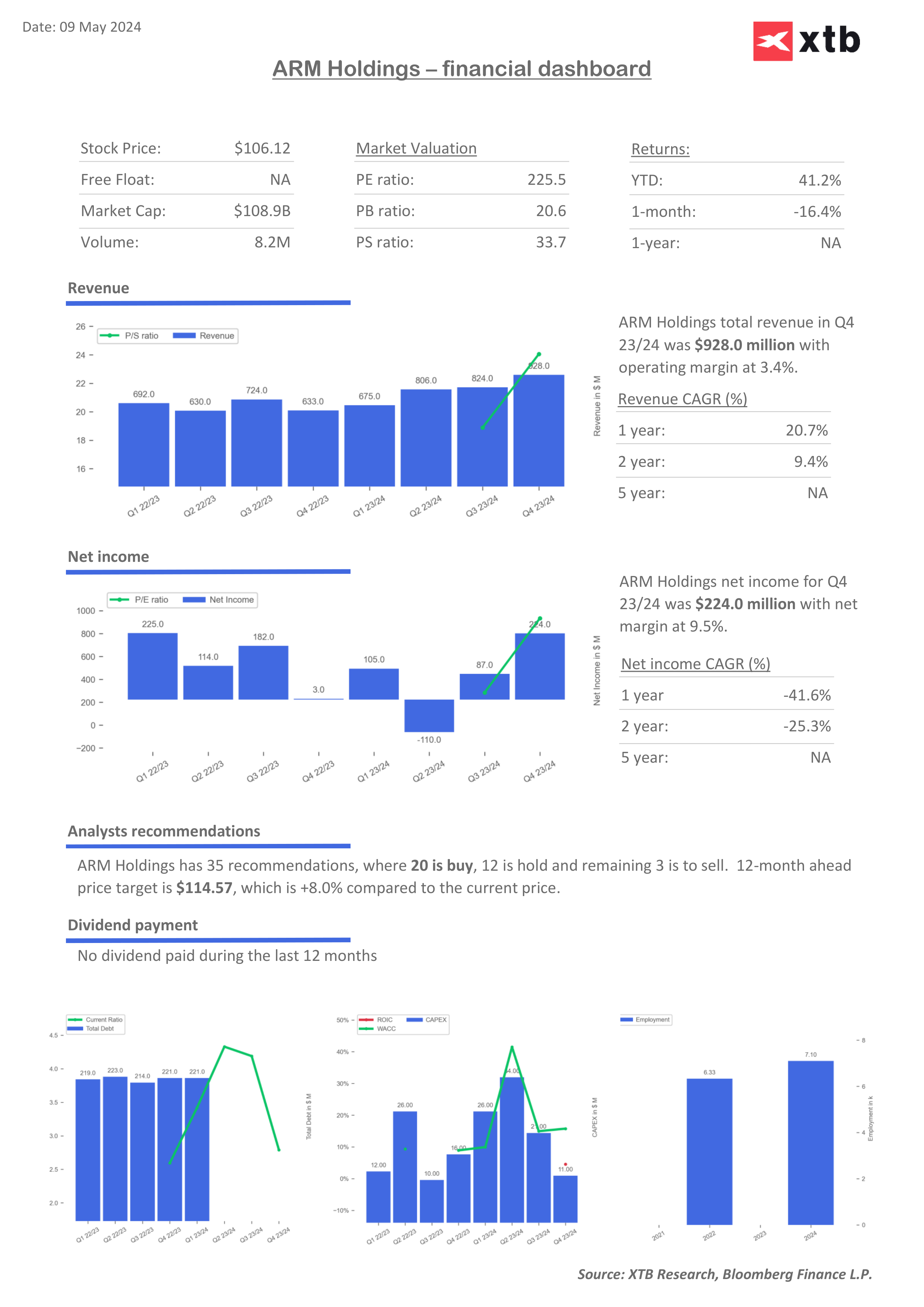 ARM Holdings (ARM.US) published fiscal-Q4 2024 earnings report yesterday after close of the market session. While results for the January-March 2024 quarter were better-than-expected, fiscal-2025 guidance offered by the company has been seen as somewhat disappointing. This has triggered a post-earnings share price drop in the after-hours trading yesterday, and stock continues to trade around 8% lower in premarket today.