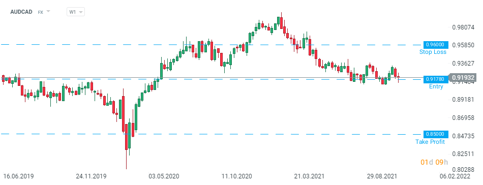 Goldman Sachs recommends taking a short position on AUDCAD at 0.9178 with a target of 0.8500 and a stop loss order placed at 0.9600. Source: xStation5