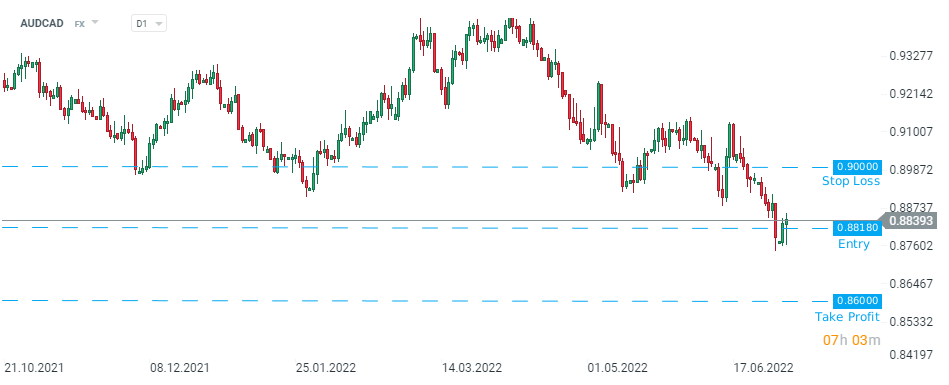 Morgan Stanley recommends taking a short position on AUDCAD at 0.8818 with a target of 0.8600 and a stop loss order placed at 0.9000. Source: xStation5